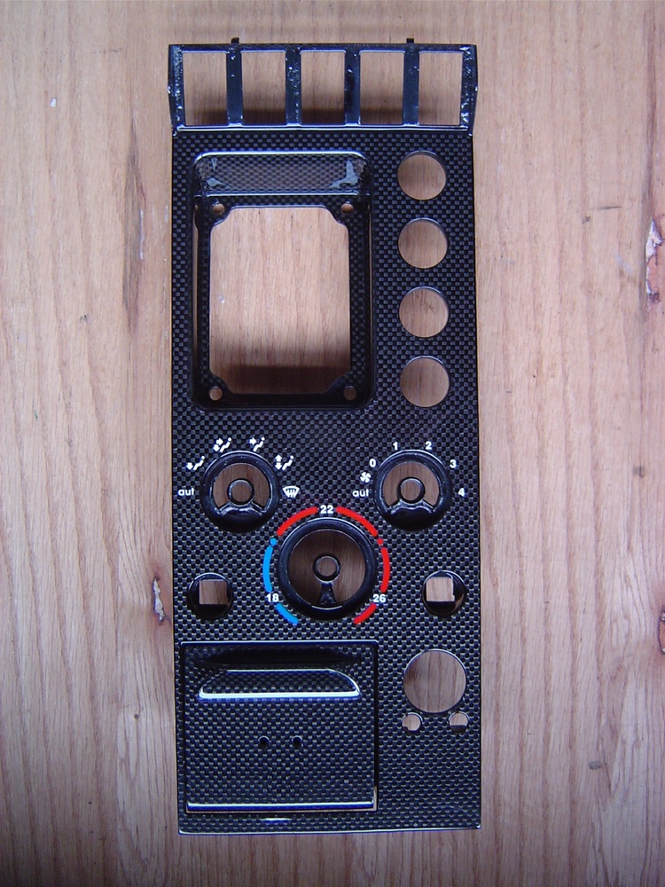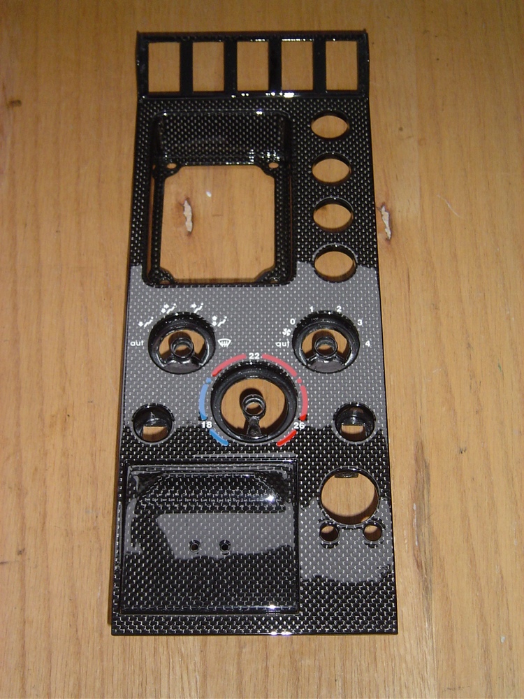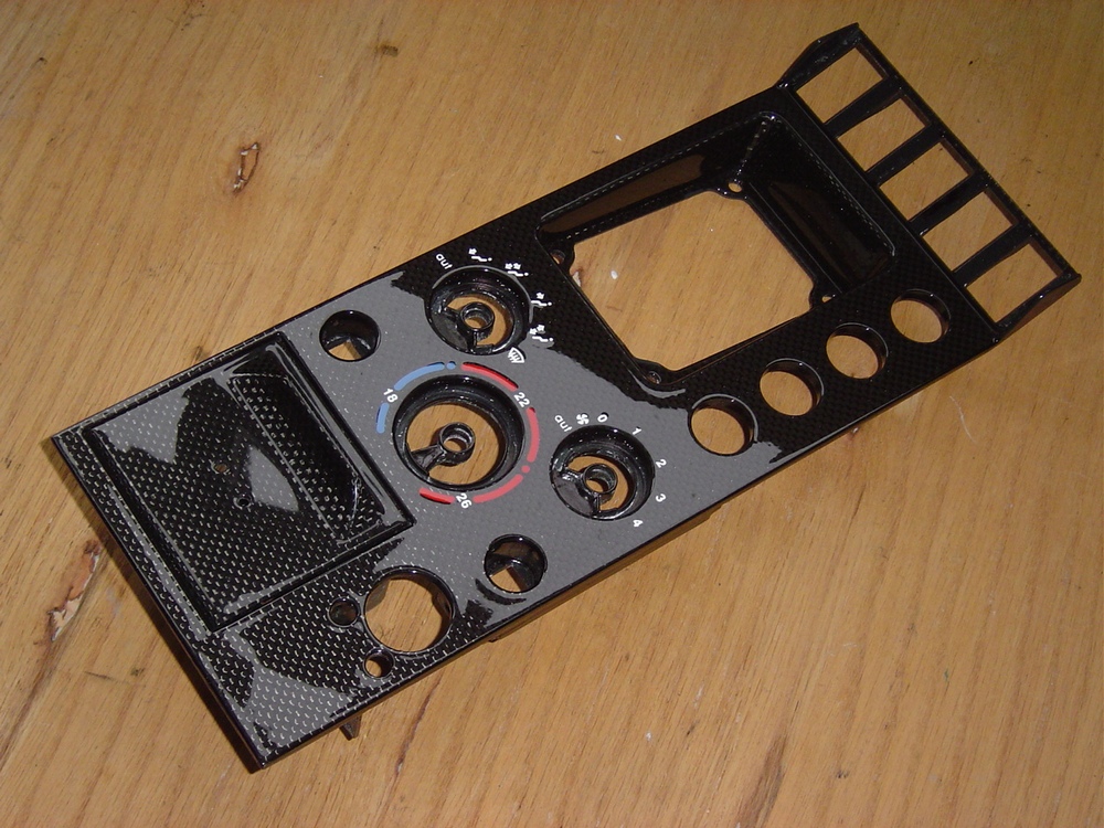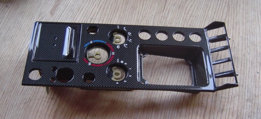 Replacing our previously offered individual shifter, climate, and ashtray panels, this one-piece unit provides an incomparably elegant solution for those desiring center console panel replacement. This carbon fiber panel is a direct replacement for the stock plastic parts, which are prone to warping and turning "gummy". The console comes with pre-drilled attachment holes, and molded-in mounting studs on the backside of the part. It fits all models and years of the Ferrari 355, with no modifications to either the part or the vehicle. The stock shift gate, climate control knobs, 12 volt power adapter, and all buttons fit securely in place with stock hardware. Console attaches to vehicle with stock hardware. Thick urethane clear coat provides incredibly smooth, deep gloss and excellent durability. Available in left-hand-drive and right-hand-drive versions, and manual and F1 versions. Holes for the crossed flags emblem can be pre-drilled on the ashtray lid, upon request.