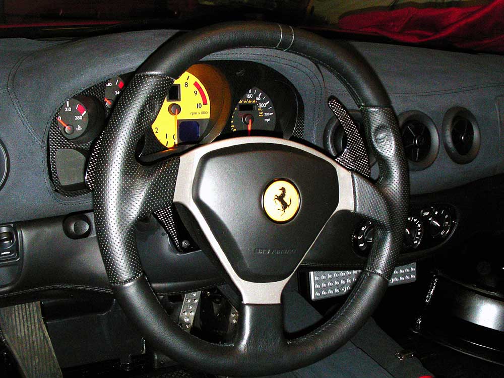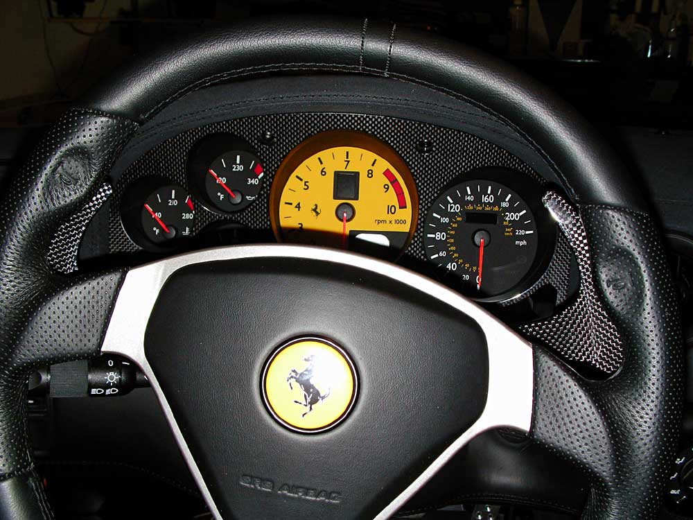 Inspired by the F1 paddles on the 360 Challenge Stradale and Enzo, these carbon fiber paddles feature tips that are approximately 1 inch longer in the vertical direction. They have a thick, durable urethane clear coat that feels great and looks even better. The backsides of the paddles have the same type of raised lip as the stock paddles, while the front sides are polished to a mirror-like shine. They are sold as a pair, and will fit on 360 F1 cars using stock fasteners. “Down” and “Up” text, applied underneath clearcoat, is optional.
