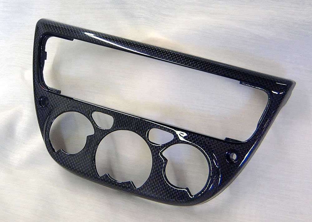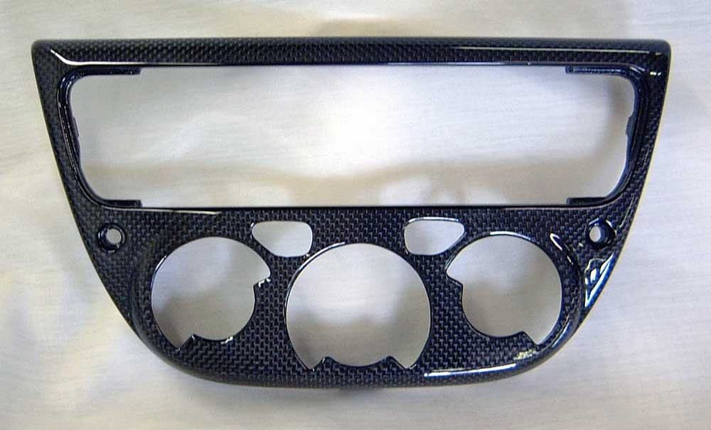 This carbon fiber stereo/climate control console is a direct replacement for the stock aluminum part. The console comes with pre-drilled attachment holes, and metal mounting studs on the backside of the part. It fits the Ferrari 360 Modena and Spider, F1 and Manual models, with no modifications to either the part or the vehicle. The stock window switches, climate control module, and stereo head fit securely in place. Console attaches to vehicle with stock hardware. Thick urethane clear coat provides incredibly smooth, deep gloss and excellent durability.