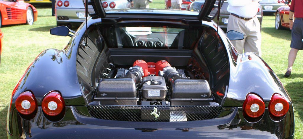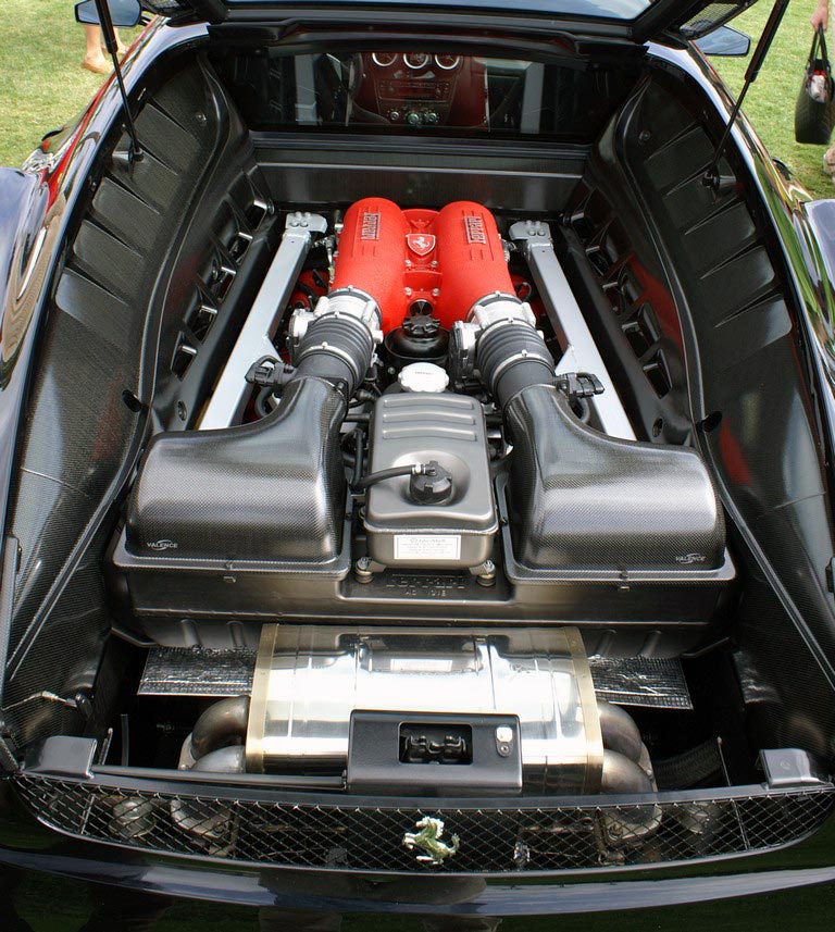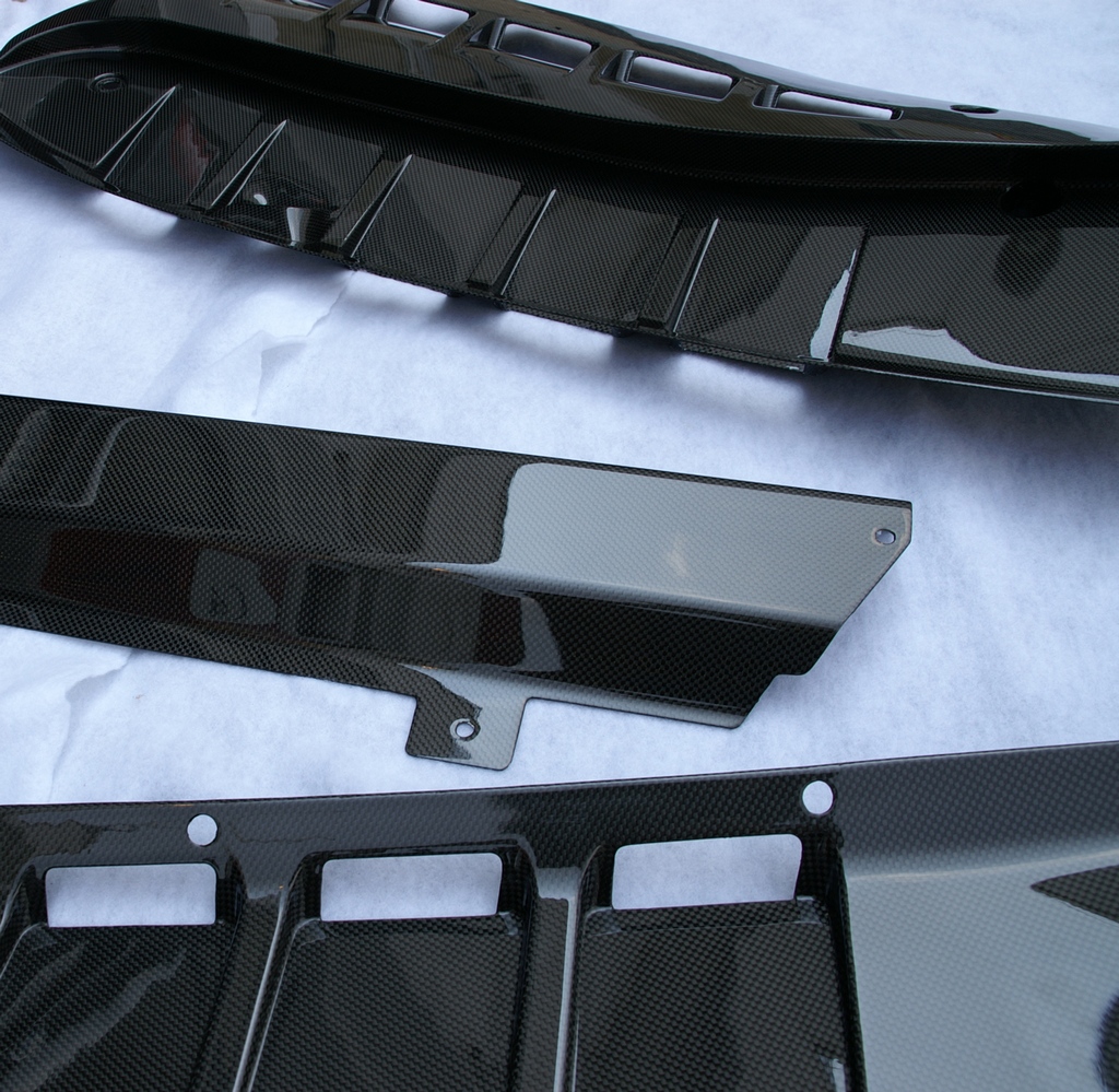 These carbon fiber engine bay panels replace the F430's stock drip panels. They are available for the Manual and F1 transmission models. Panels come with pre-drilled mounting holes. Textured urethane clear coat, which complements the intake manifold's textured red finish and reflects light with a similar sparkle, provides excellent durability in the harsh engine bay environment. This finish is shown in pictures 1-2 below. Smooth gloss urethane clear coat, shown in pictures 3-4 below, is also available. Panels are sold as a 5 piece kit, including the rectangular horizontal panel on the engine bay's front firewall.