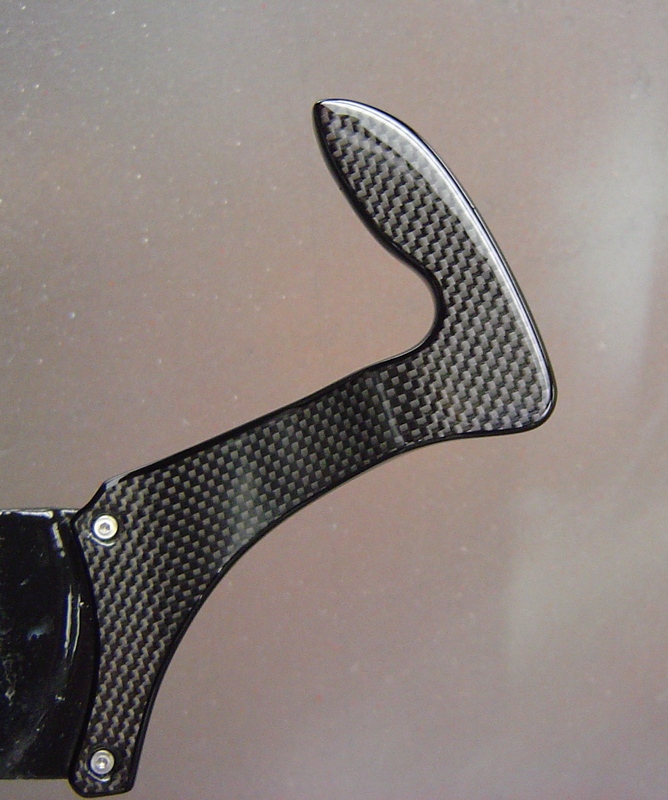 These carbon fiber paddles are the same size and shape as stock Cambiocorsa paddles. The beautiful, handcrafted paddles feature a thick, durable urethane clear coat, polished to a mirror-like shine, that feels great and looks even better. They are sold as a pair, and will fit on the Coupe and Spyder using stock fasteners. “Down” and “Up” text, applied underneath clearcoat, is optional.